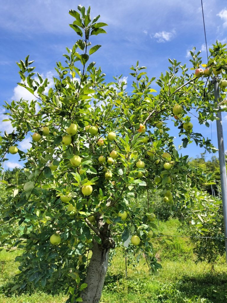 早生のりんご「さんさ」の除袋作業をしました。収穫まであと2週間、これから真っ赤に色づいてくれることでしょう!