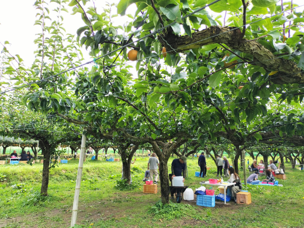 梨狩りでは、椅子とテーブル、カトラリーだけでなく、なんとお酒やグラス(!)まで用意されていたお客さんがいました。グラス持参はすごいです(笑)
