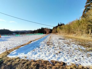 このあと、暗渠を掘ってパイプを入れる作業が残っています。夏か秋にはここに梨棚とりんご棚を建てる予定。